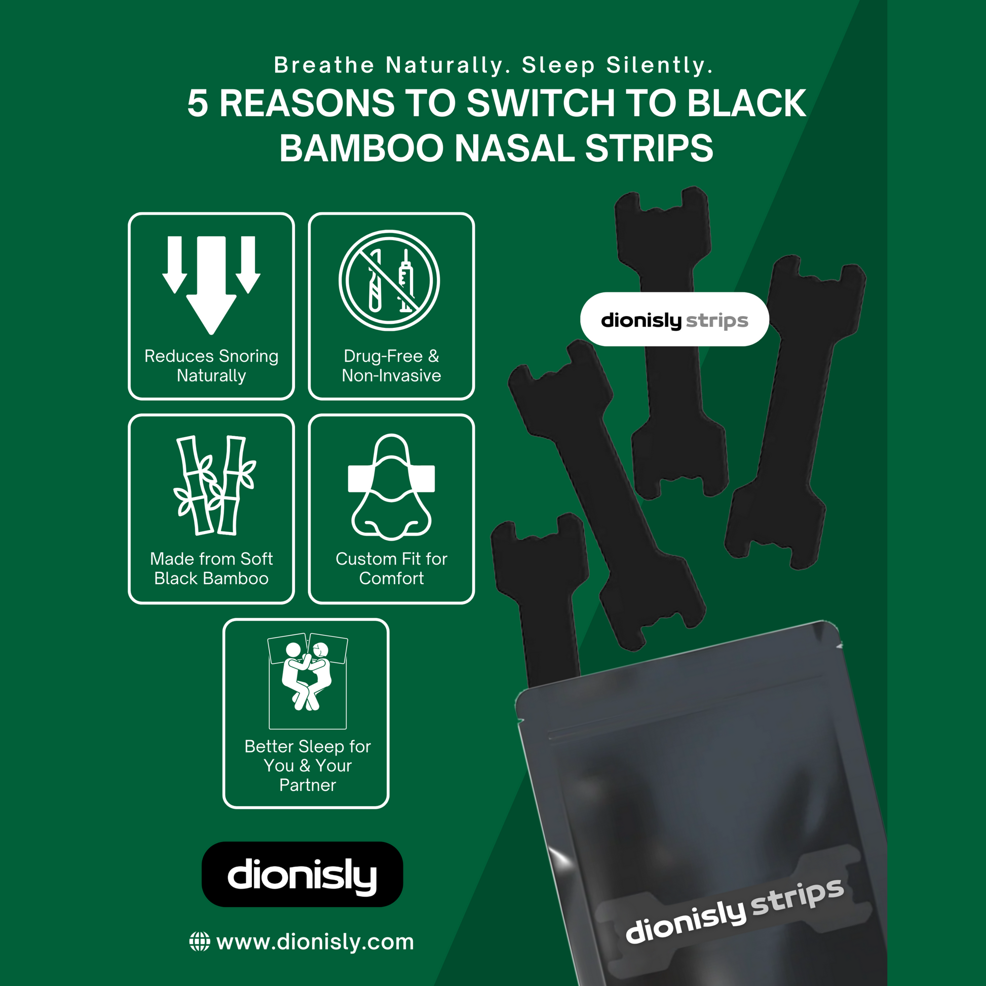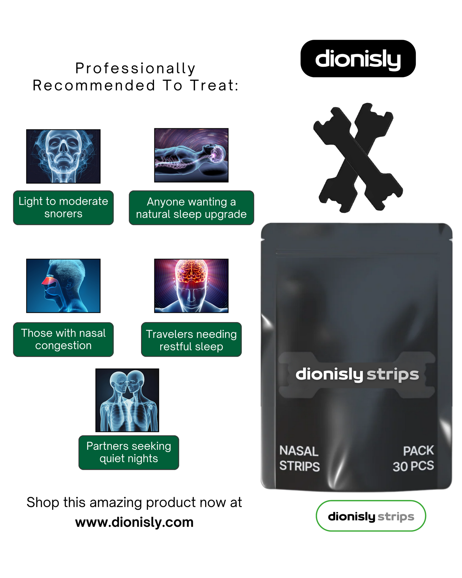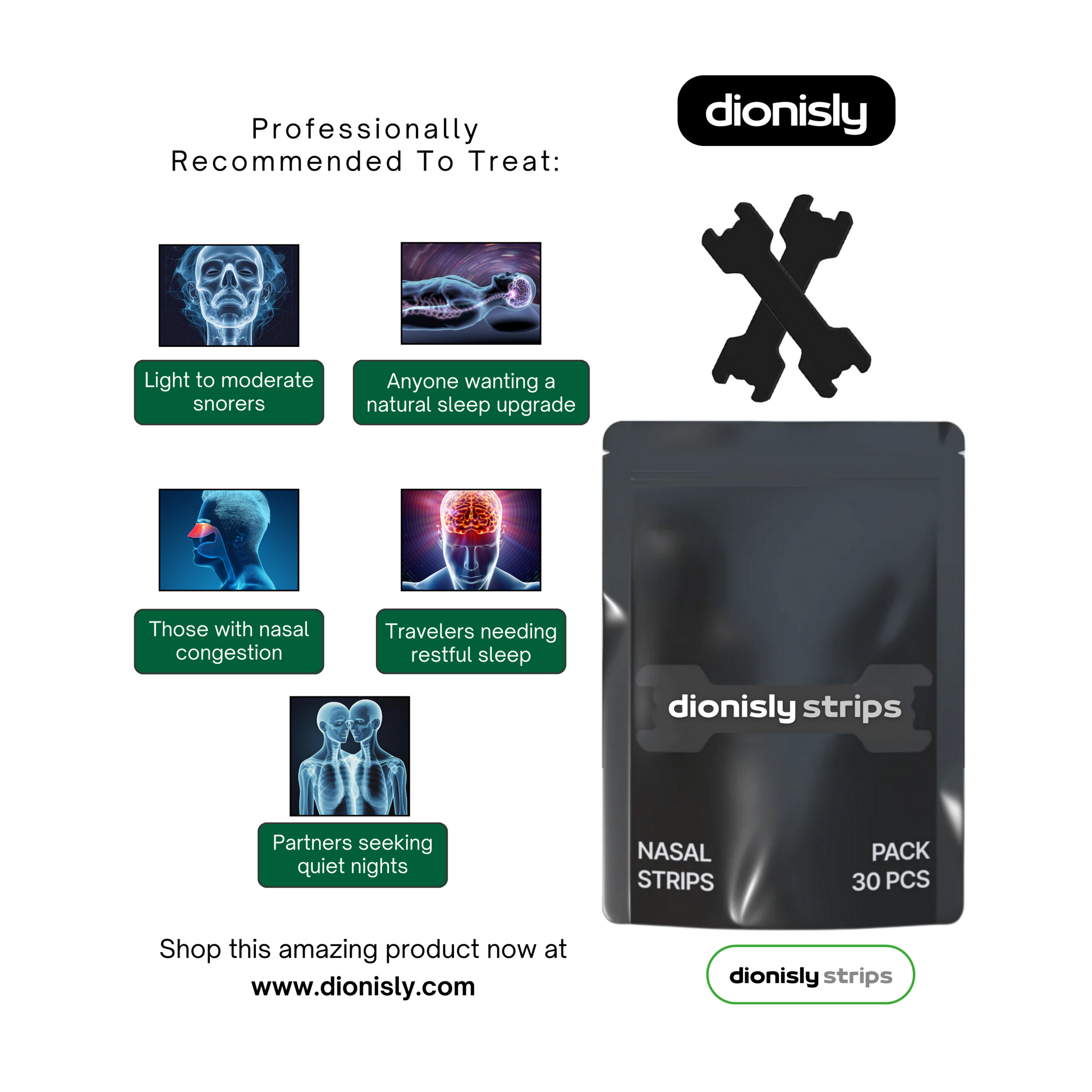 The Dionisly Strips are your solution for fast, natural relief from snoring, nasal congestion, and restless nights. Whether you’re struggling with blocked airways, light to moderate snoring, or simply want a better night’s sleep, these strips offer a comfortable, drug-free way to breathe easier and sleep deeper.