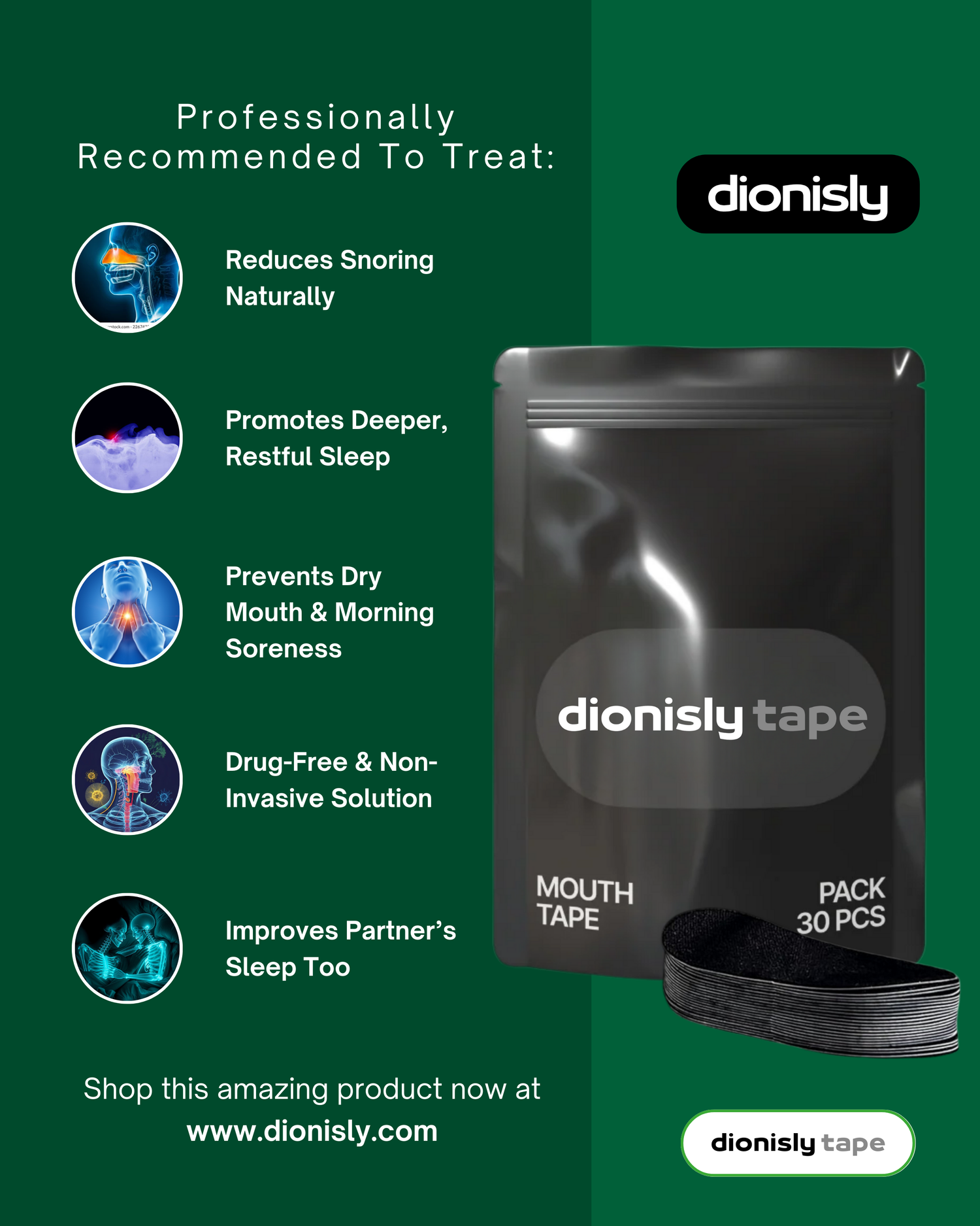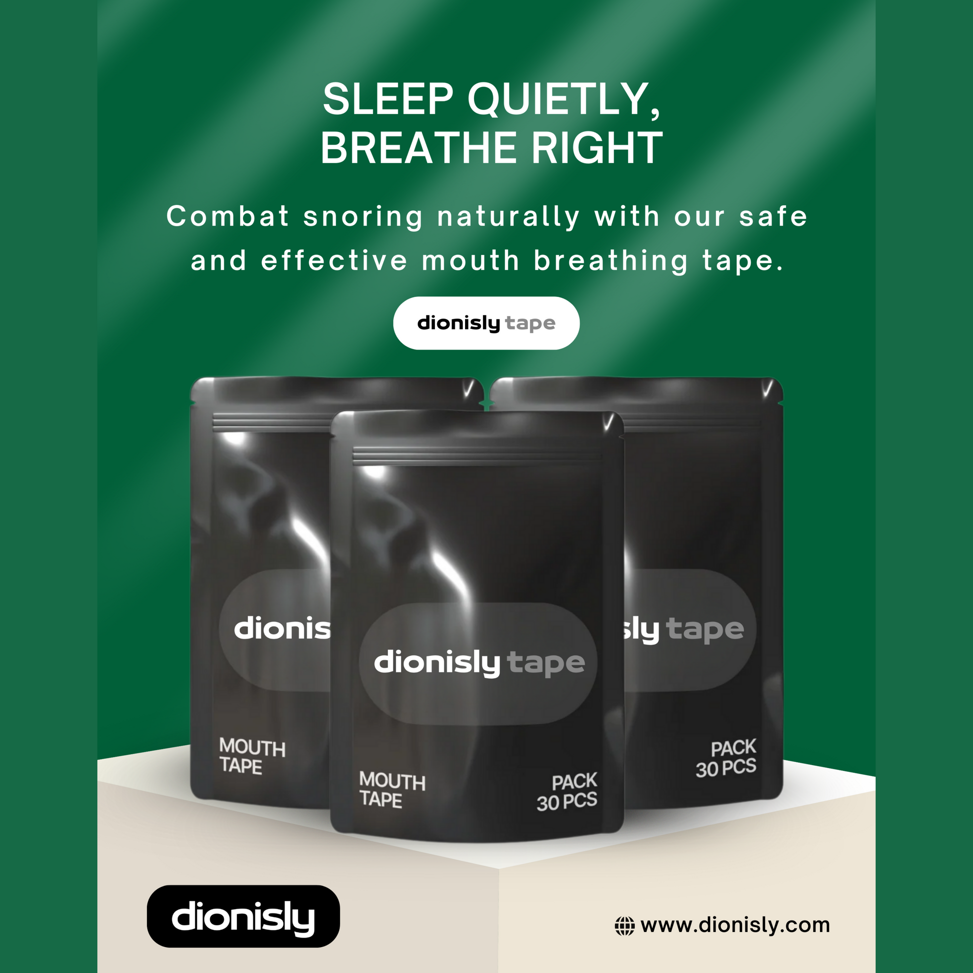 Don’t let snoring disrupt your life. Join thousands of happy sleepers using Dionisly Tape to breathe better and sleep deeper—naturally.
